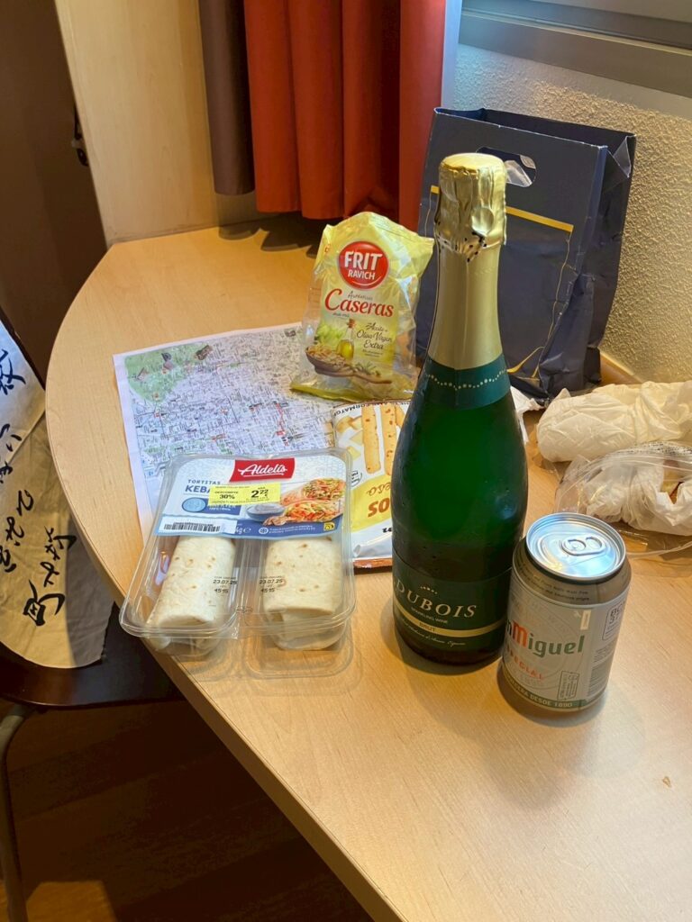 気を取り直して今日は開いているショッピングモールへ、100Montaditosというファストフード店で生ビール×3とナチョスで6.5€(1100円)安い!メルカドーナというスーパーではスパークリングワインが3.2€(約550円)でした。レストランはとても高いですが、ファストフード店やスーパーのお酒はヨーロッパでも驚くほど安いです。毎晩スパークリングワインのフルボトルを1本やばいです。