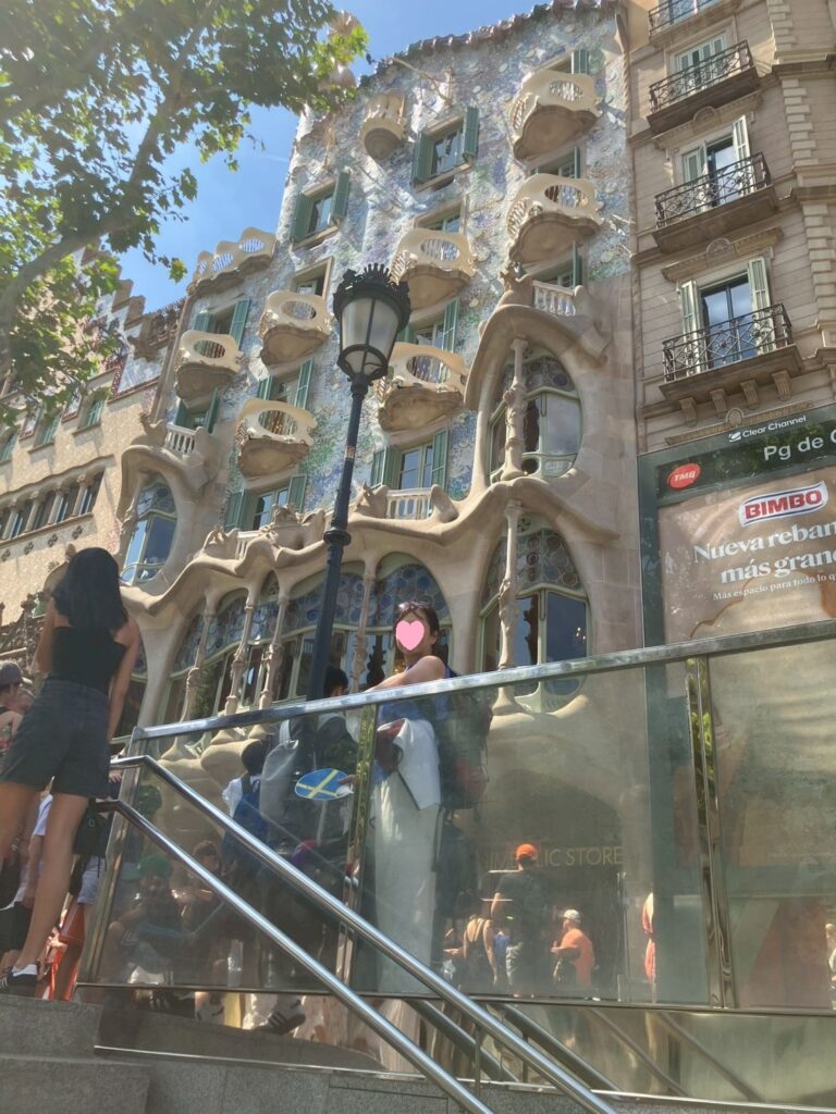 キャリーケースは預けて10時ホテル出発、徒歩2分のヴィラデカンス駅からRenfe(国鉄)に乗ってPasseigDeGracia駅へ、22分4駅ですぐに着きます。1人2.65€(450円)バスと同じ値段、格安です。改札口から上にあがると目の前にガウディ建築のカサバトリョ、入場料は日時によって変わりますが公式サイトで平均1人30€(約5200円)う~んパス。少し歩いてこれもガウディ建築のマンション、カサミラ。