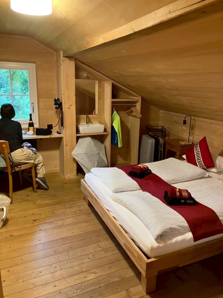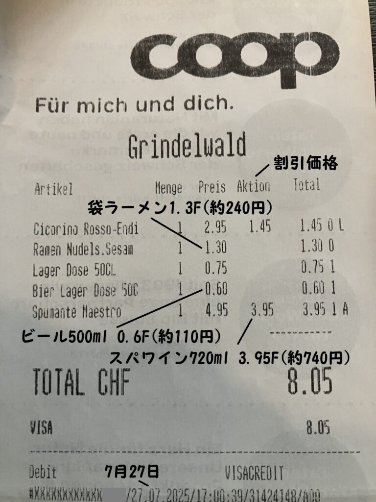 グリンデルワルト駅前のコープで買い出しして部屋飲みです。ビールは500mlが1本0.6フラン(約110円安すぎ)スイスは物価が…とよく言われますが、コープ最強です。ホテルは山小屋だからか、共同のキッチンルームがありコンロ、鍋、電子レンジ、食器等完備でした。