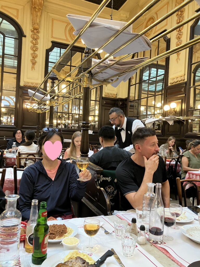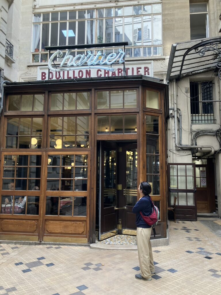 その後バスでブイヨンシャルティエという老舗のフランス料理店で夕食。安くておいしいと評判の店で並ぶのを覚悟していましたが、あっさりと入れました。4人掛けの席で後から老紳士と相席になりました。食べ放題のフランスパンは共同で(笑)