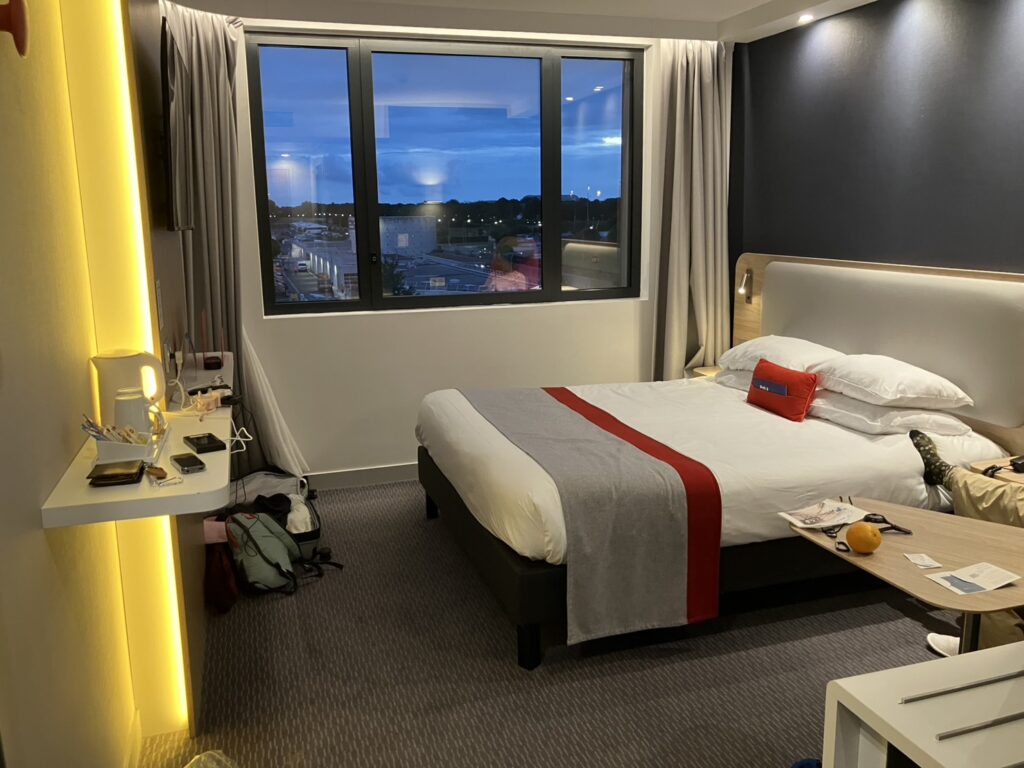 17時30分チューリヒ国際空港発スイスエアー644便でパリシャルルドゴール空港へ1時間20分のフライト、時差はありません。19:00空港着、今回鬼門のシャトルバスです。ターミナル1、4階TGV駅の上のシャトルと事前に調べていたものの、まさかターミナル間を移動する電車のことだと気づかず、駅員さんに聞いたところホリディインとホリディインエクスプレスを間違え、違う場所を教えてもらうことに…。やっとのことでバスに乗り込みましたが出発直前になってこの「バスちゃうで、VALシャトルやで」といわれ降ろされてしまいました。VALはターミナル間を結ぶ電車、わけがわかりません。悩みながらシャトルに乗って案内をよく見ると駐車場駅の下に小さくホテルの表示が…。電車の駐車場駅から徒歩でした(トホホ)。21時近くになり、やっとホリディインエクスプレスパリCDGエアポートホテルに到着。