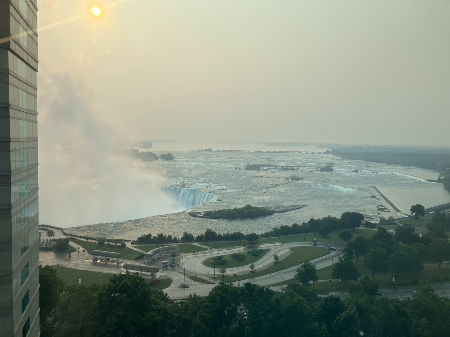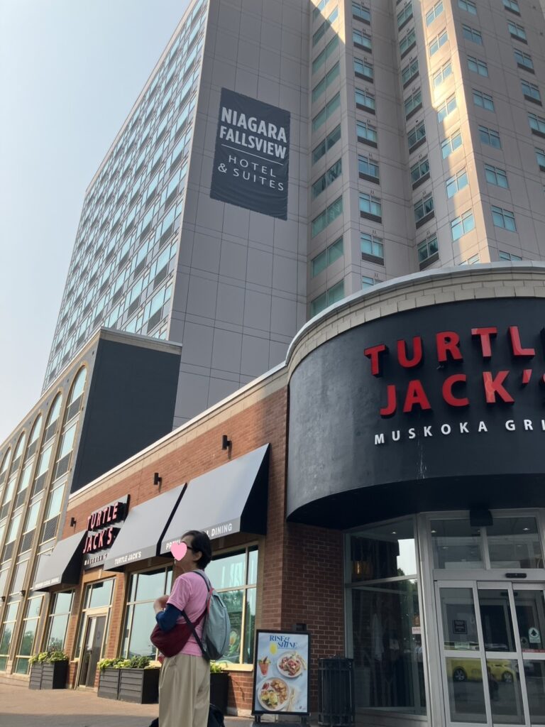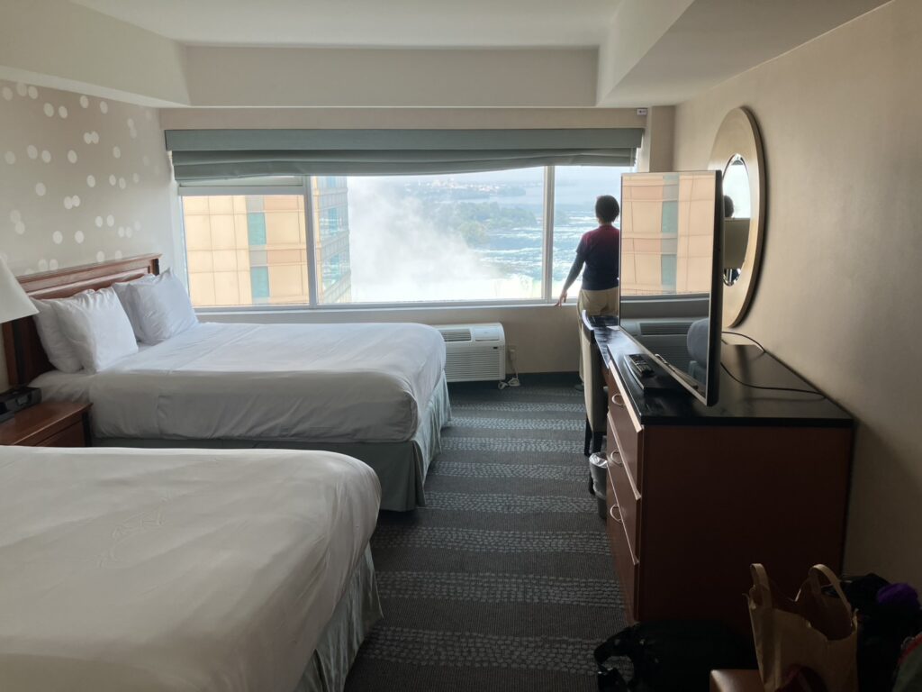 ナイアガラの滝近辺からホテルエリアへはすぐ近くなのですがケーブルカーを使わないといけない構造(有料2人で片道840円)になっていてうまくできています。とりあえずホテルへチェックイン。IHGグループのナイアガラフォールズビューホテルをとりました。ちょっと豪勢にナイアガラの滝が見下ろせる部屋を予約、2人素泊まりで1泊50000円でした。