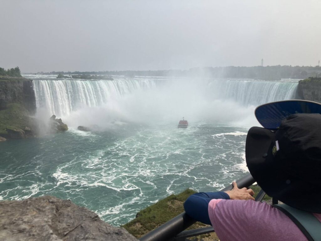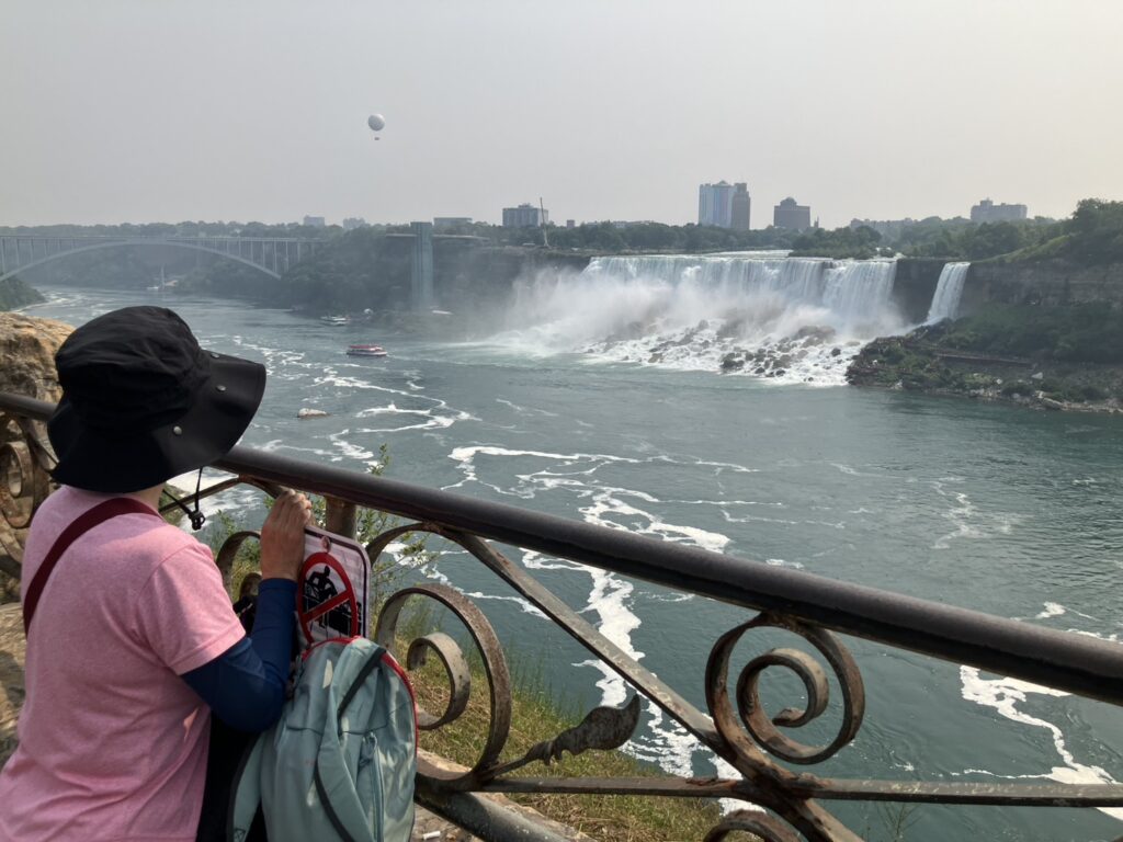 ナイアガラの滝へは空港から発着しているFLIXBUSで向かいます。事前に公式サイトから予約しました。往復2人で8500円、トイレ・WIFI付き約1時間45分の行程です。今日は移動のみなのでホテルでゆっくりし12時チェックアウト、いつも通りキャリーケースはホテルに預けます。シャトルバスで空港に戻り、14:20のバスに乗り込みました。しかし大渋滞で3時間かかりました。WIFIも2Gで使い物にならず。バス停から徒歩5分でホテルに行けるはずと調べていたのですが、遠く離れた公園に到着。そこからWEGOという無料バスでTableRockへ、ナイアガラの滝に到着です。すごい迫力!