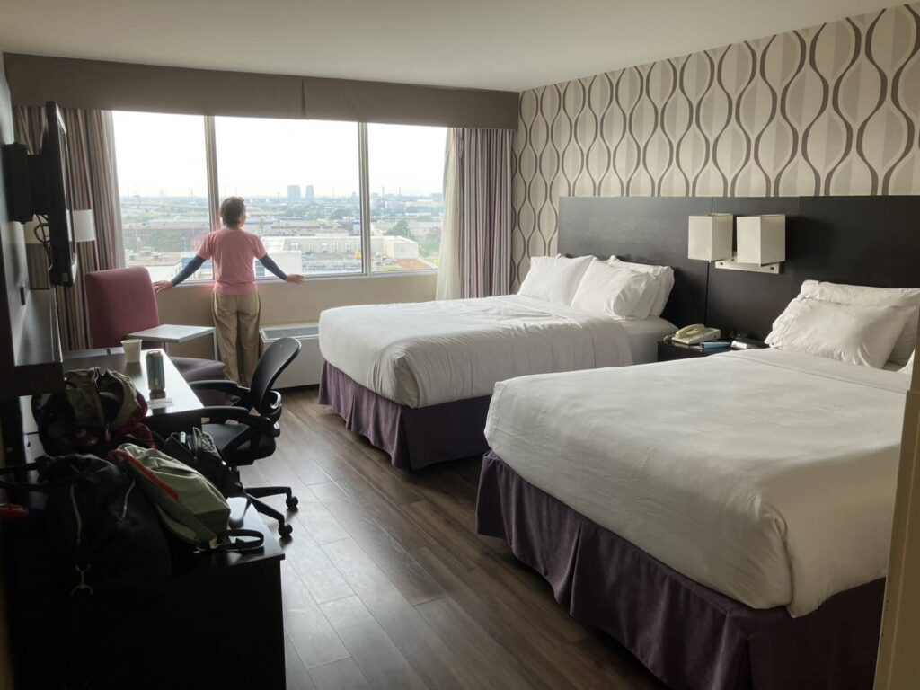 12時40分のエアカナダ123便で大西洋を渡ります。フライト時間は約8時間、エアカナダのビジネスクラス座席も独立式で快適です。トロントピアソン空港に15時に到着、日本との時差はー14時間です。ここでもシャトルバス問題が…。バス停で待つも、中々こないのでホテルに電話すると自動音声案内で下のフロアを案内される。で下で待つも全然来ない…。結局上だよと言われまた上のフロアに。じっくり待つと普通に来ました。大手ホテルチェーンのシャトルバスは大体30分おきに24時間運航しており、のんびり待つというのが正解なようで。ホリディイントロントインターナショナルエアポートへ無事到着、アゴダで1泊朝食付き25400円でした。IHG会員で予約するよりアゴダの方が安かったのでそちらで予約したのですがチェックイン時の白人男性のスタッフの対応が悪く、自動音声でシャトルバスに迷ったことをチクリというと最悪な部屋に案内されてしましました。一見広くてきれいなのですが空調と部屋の位置が悪く埃っぽい部屋でした。