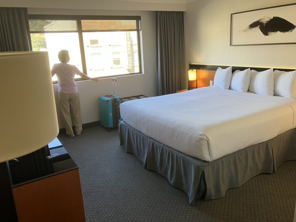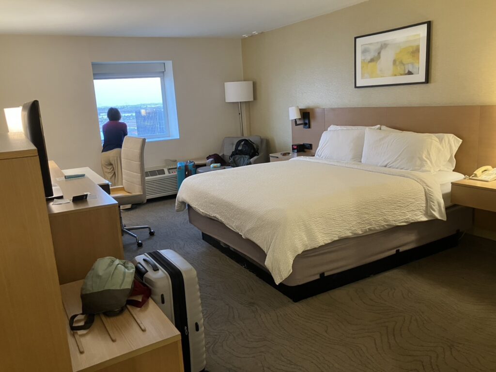 最初9時半の便を予定していましたが欠航のためやむなく16時40分トロントピアソン空港発エアカナダ793便でロサンゼルスへ、フライト時間は約5時間です。日本との時差はー17時間ですので(トロントとの時差3時間)19時にロサンゼルス国際空港へ遅めの到着。空港近くのホリディインロサンゼルスLAXエアポートへ、今回はシャトルバスうまくいきました。IHG公式サイトから予約、直前に10ドルで部屋のアップグレードのメールが来ていましたので、トロントのこともあり迷わず選びました。1泊朝食付き2人で29500円でした。最上階の良い部屋でした。