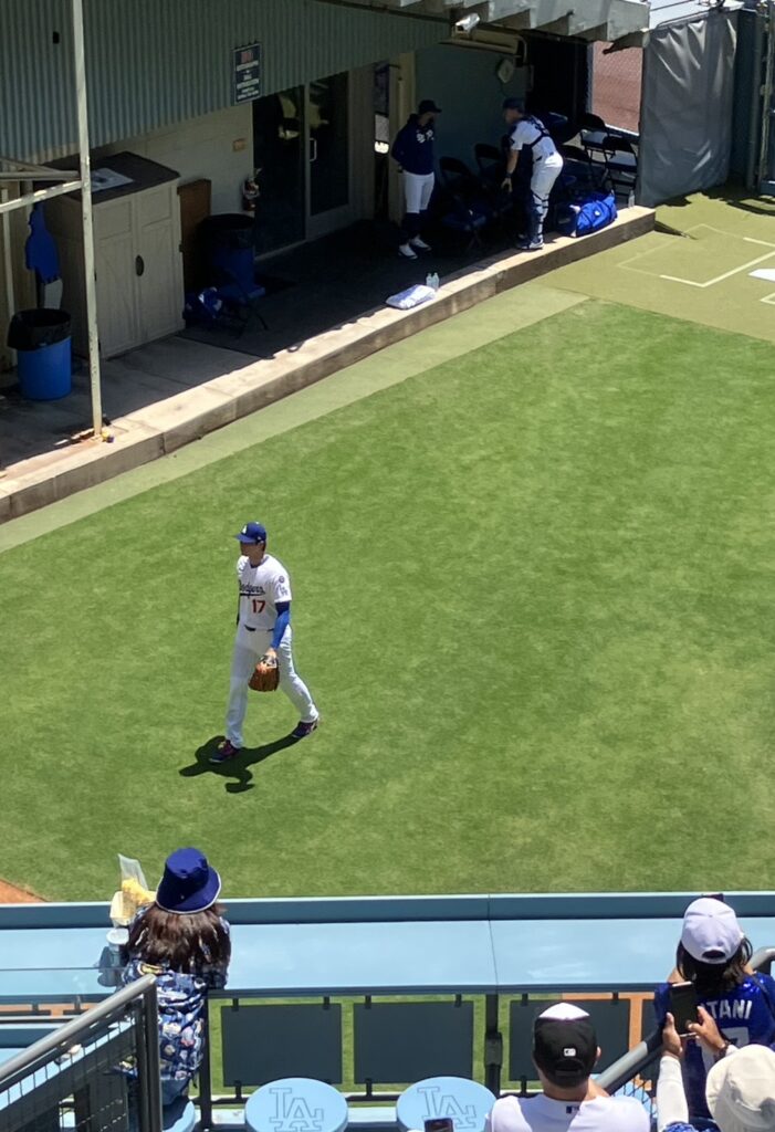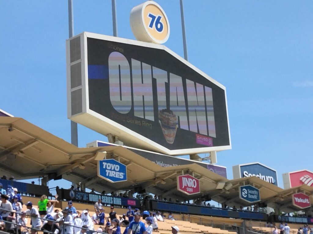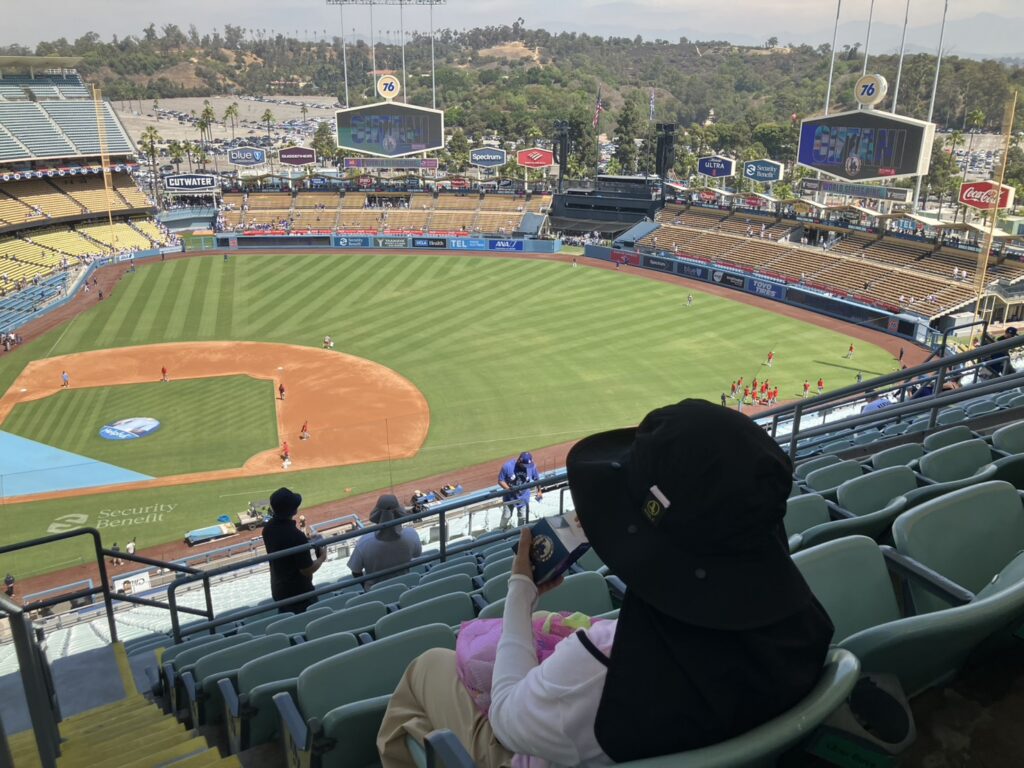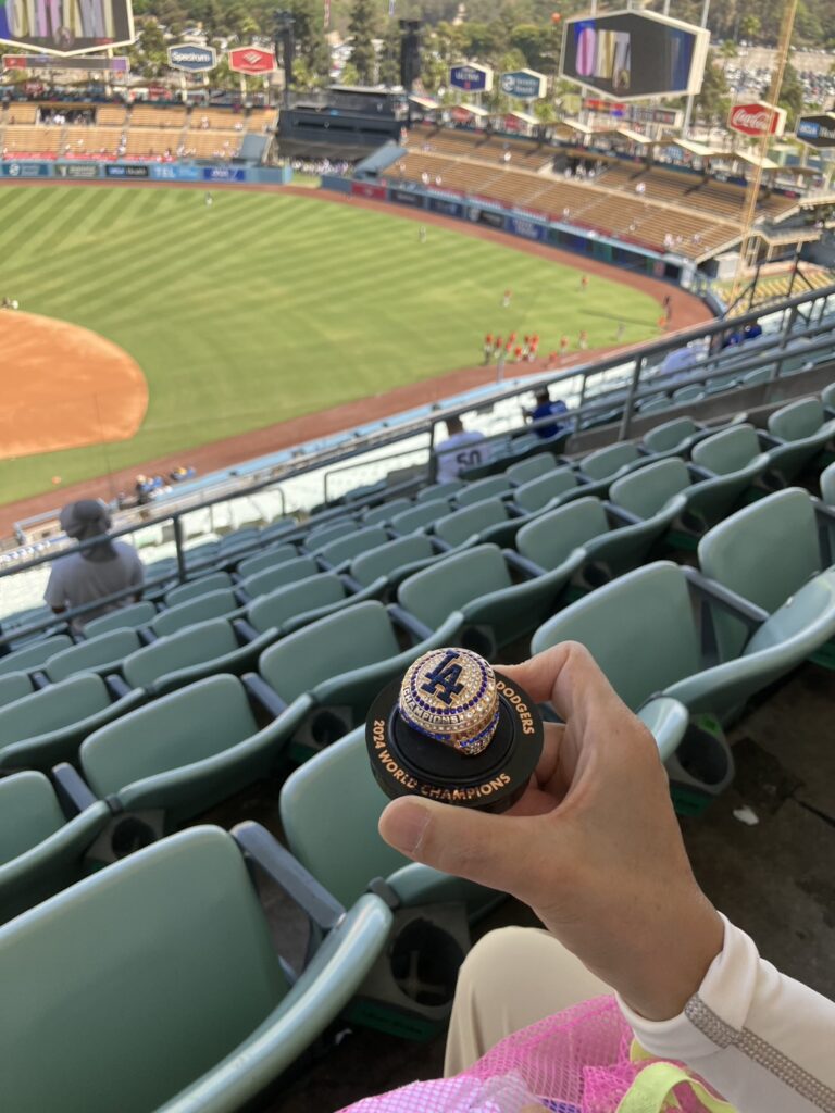 ホテルで朝食をとり、いざドジャースタジアムへ、今日はデーゲーム(13時試合開始)です。ロサンゼルス残り2泊はミヤコホテルロサンゼルス、アゴダで予約、2泊素泊まりで2人で56500円でした。日本のホテルですので安心です。ホテル間移動はUBERで。40分、約9600円もう慣れました。治安の問題でロサンゼルスでは基本的に移動はUBERにしました(近くで暴動の起きた2週間後ということもあり)。UBERは時間によって金額が大きく違います。ただ金額が最初からわかっていますので安心、ドライバーの評価も事前にわかり選ぶことができます。10時出発、ミヤコホテルに荷物を預け再びUBERでスタジアムへ。ホテルからは3.5km、10分、約2500円、気温が高くかなり暑いです。今日は大谷選手のワールドシリーズリングがもらえる日です。チケットは事前に公式サイトからとりました。公式サイトは座席も指定で選ぶことができ座席からのグラウンドの見え方なども調べることができます。安めの席で2人で26000円でした。入場には注意点があり、持ち込めるバッグは30㎝×30㎝×15㎝までの透明なもの+20㎝×12㎝×5㎝までのポーチと決まっています。